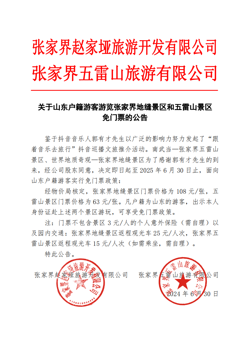 關(guān)于山東戶籍游客游覽張家界地縫景區(qū)和五雷山景區(qū)免門票的公告