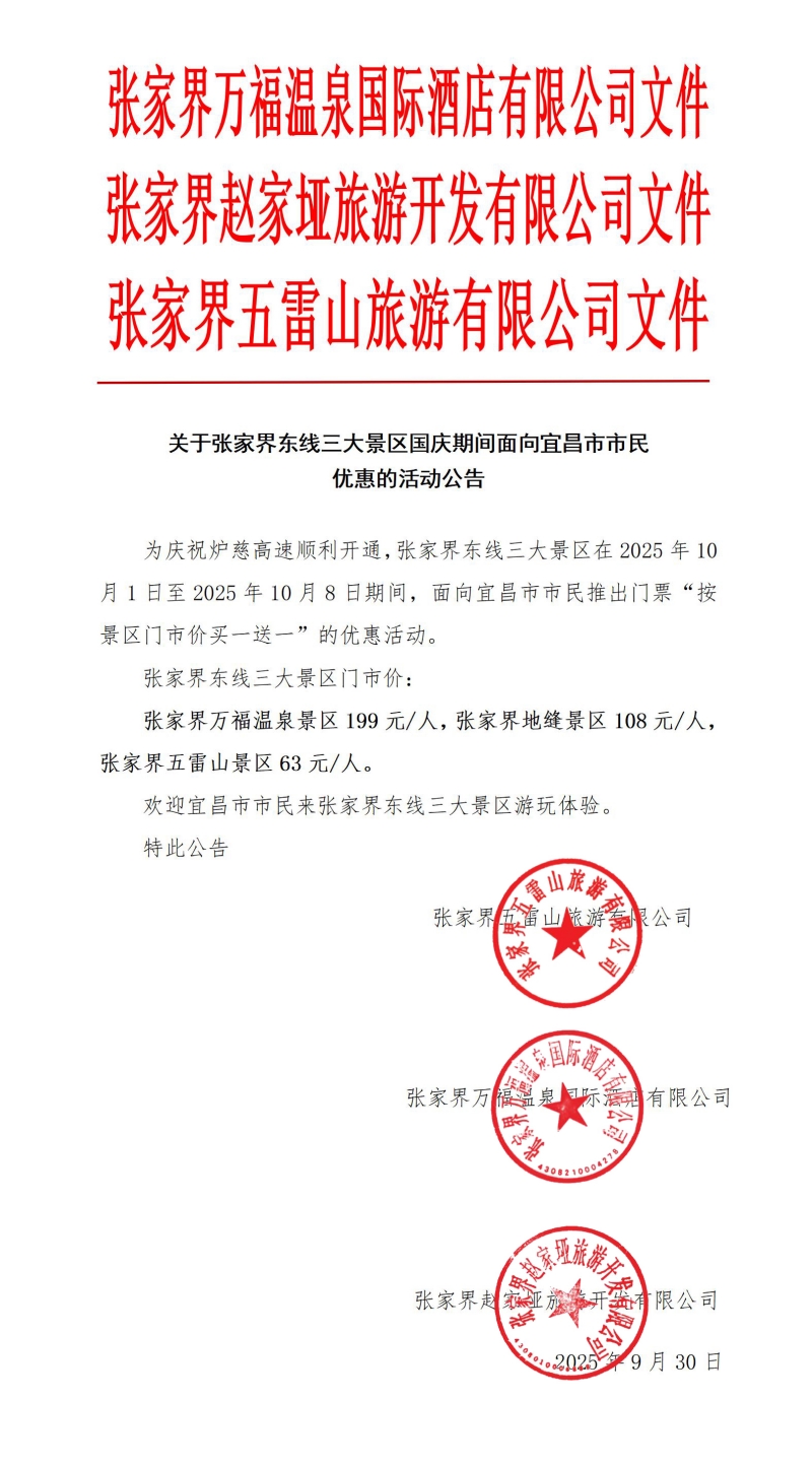 關于張家界東線三大景區(qū)國慶期間面向宜昌市市民優(yōu)惠的活動公告